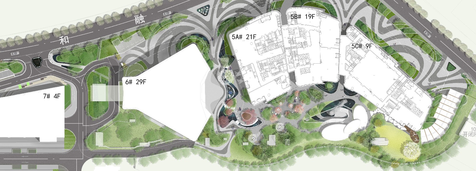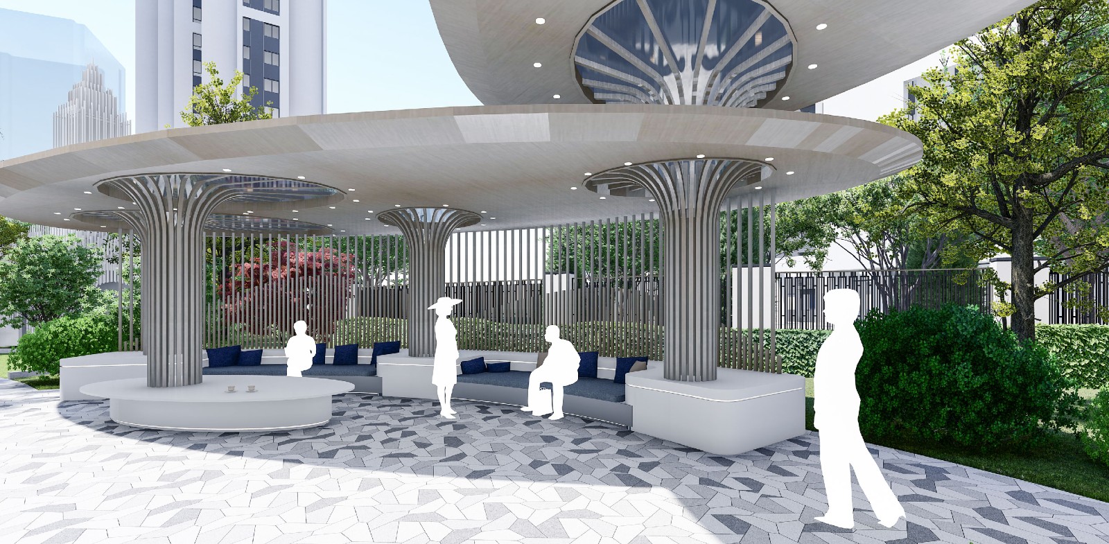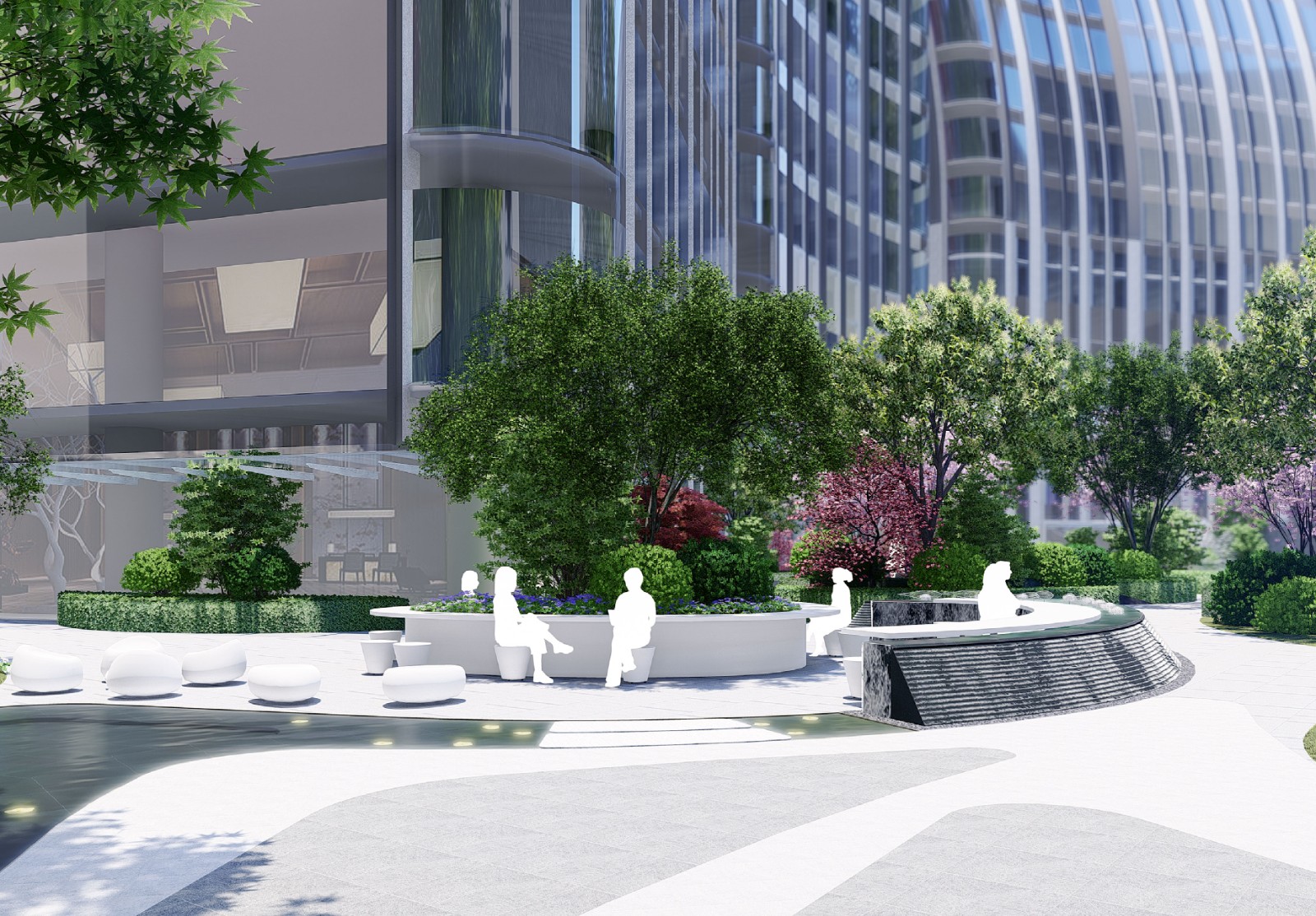 陆玛希望这里是慢生活的起点,是艺术的殿堂,是城市中的一处港湾,于是有了“海洋之森,都市中的心灵港湾”这一景观主题。“海洋”,是生命的起源,同样也是度假、浪漫、包容的代名词。项目中的酒店模块与度假印象相契合,而理想中的度假应是温暖的海洋、海岛、沙滩,是浪漫、休闲的氛围,而这也是景观所要打造的场地气质。“森”与中懋天地的“懋”字相呼应,具有茂盛、盛大之意,同时也决定了场地绿树成荫的景观环境。