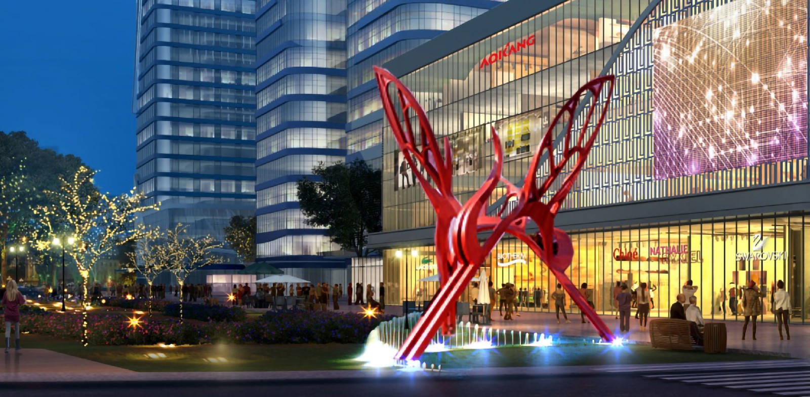 本项目的设计以蝴蝶为灵感,希望通过我们的设计,项目基地可以冲破束缚,为城市的破茧蝶变带来机遇。景观设计延续了建筑设计中的蝶翼设计语言,将景观的肌理作为延申,将蝶变这一设计主题应用到了整个项目的设计当中,更将破茧,抖翼和飞舞这三个蝶变的阶段变幻为不同的空间设计语言应用于全区的设计。根据功能分区的不同,形成了蝶翼流光酒店区,蝶翼轻扬办公区,以及彩蝶之夜商业区这三个主题区域。打造出同时满足艺术性要求与空间功能性要求的新型商业综合体。