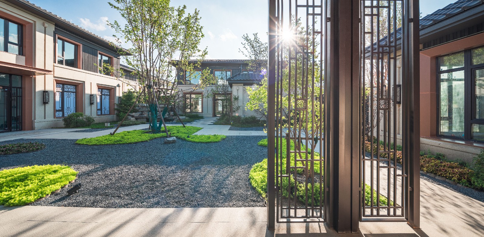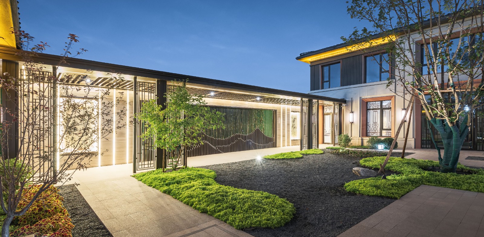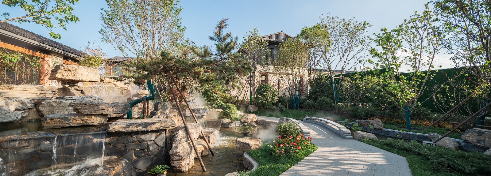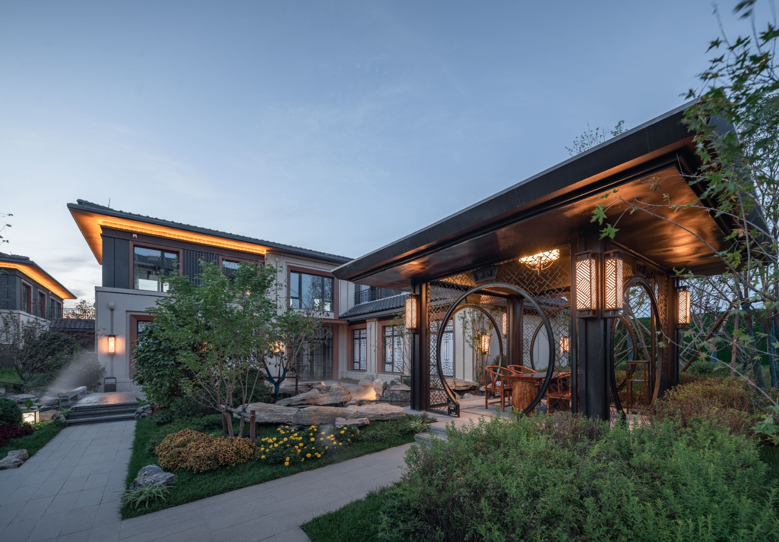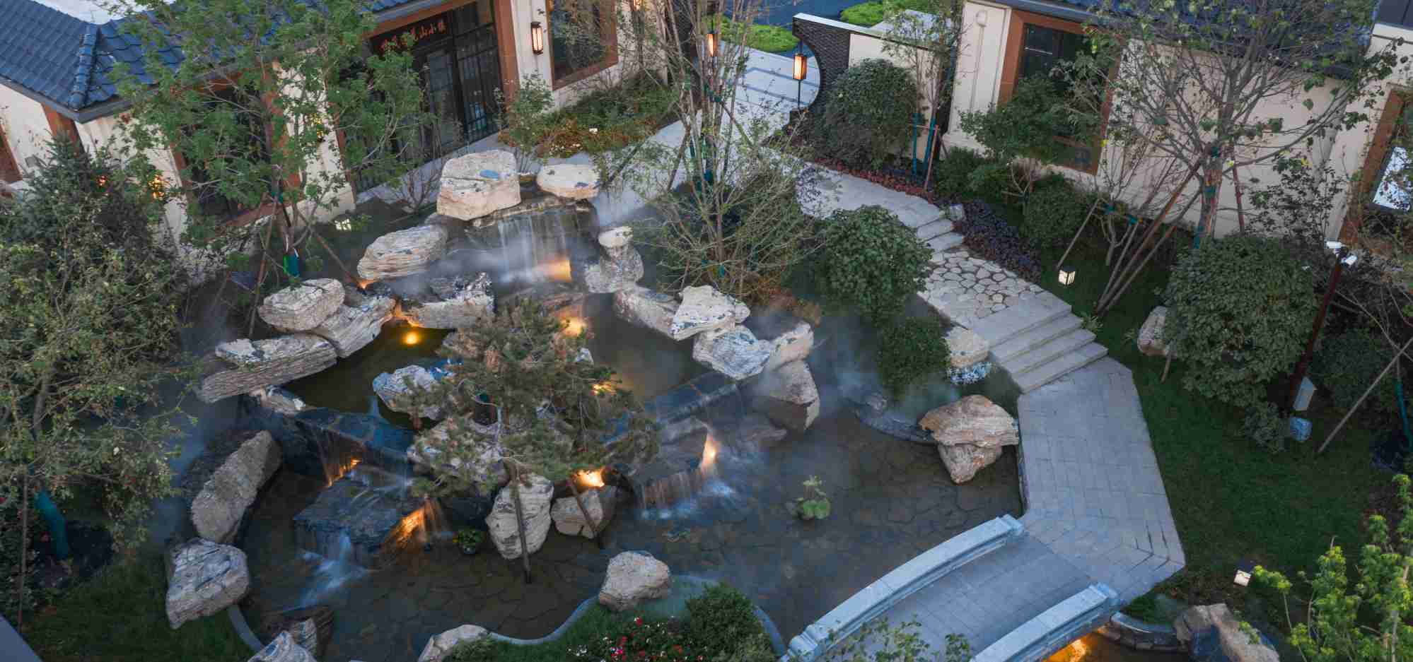 项目地处长春市二道区莲花山景区内,自然条件优越、山水相间、层峦叠嶂、云雾环绕,仿佛人间仙境。将环境中的“山”“水”“林”“云’作为设计主题,将现代的设计语汇与传统中式园林的造园手法相结合,打造一处“离尘不离城”的世外桃源。采用五进式归家礼序,凝练中式千年礼制文化,营造五进空间格局,层层进阶,呈现不同的空间意境。