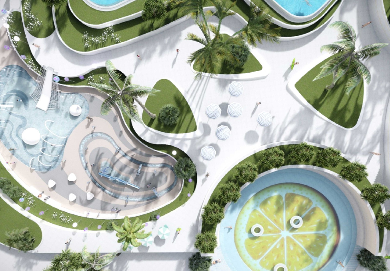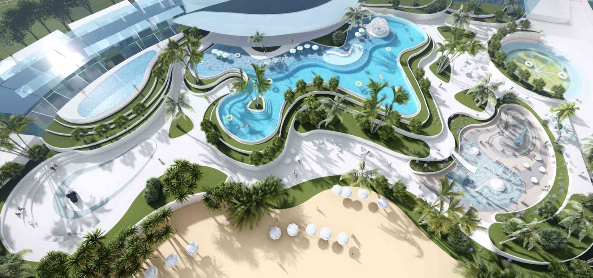 以海洋为元素的度假村,海浪叠加的纹理形成景观的整个形态,把整个设计的线条与建筑融合形成动静结合的景观结构。建筑外由密集到稀疏,与整个景观的高差关系形成呼应,将休闲性、娱乐性发挥极致。