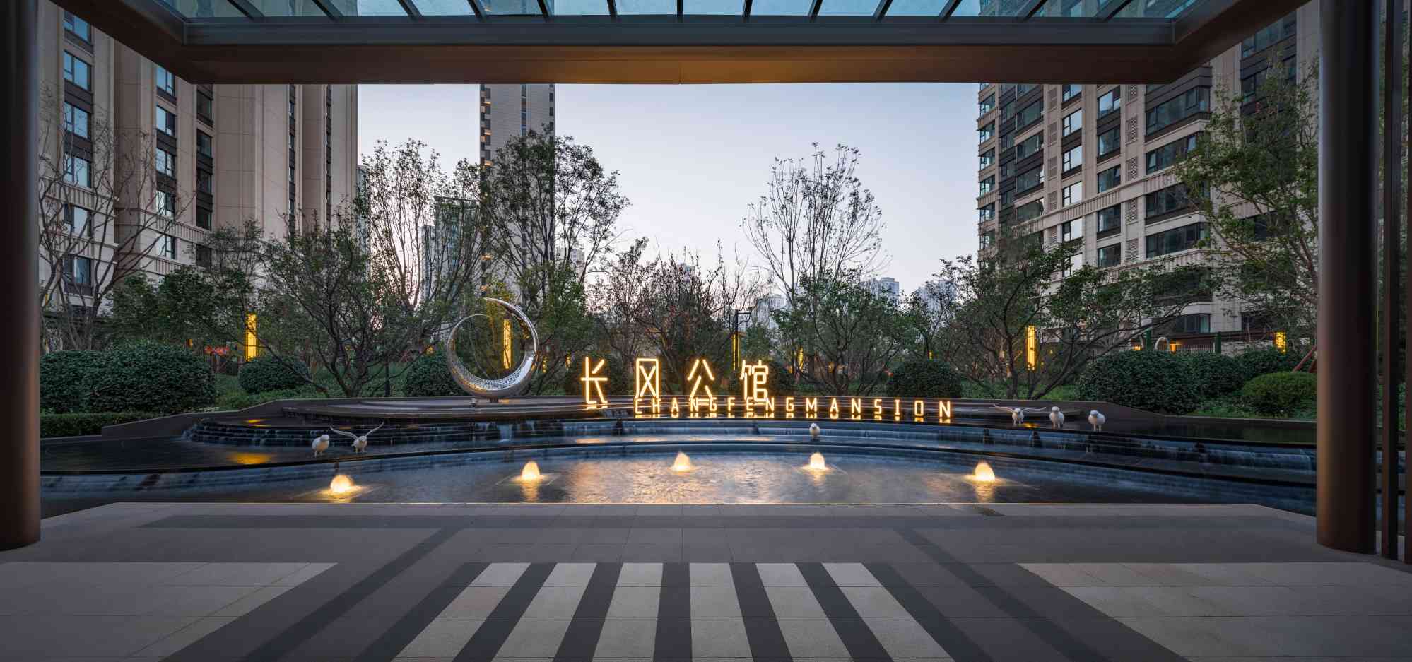 设计通过流线水景柔化了整个迎宾区域的空间线条,赋予了入口空间直观的艺术性感受。入园,水光半镜赫然眼前,层层叠叠的 “水波”,层层迭起,逐级入微。月牙雕塑浮于水境之上,波光涟漪,灯光温柔,方寸之间尽显“明台镜月”,结合跳跃的涌泉LOGO,形成记忆焦点,呈现出如艺术品般的高级品质感,如一处月出梦泽的绮丽幻境。水中不时几处的飞鸟雕塑,或两两相伴,或几组成群,言情意趣,远离了都市喧哗的节奏,进入了潺潺流水的微光中,营造奢华尊贵的归家氛围。